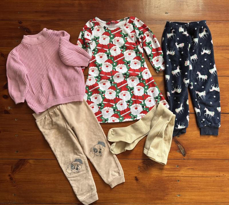 Пакет одягу для дівчинки, носили в 4 роки, до 98 см. 90 грн за все. Штанці махрові, штанці на флісі, кофта, новорічна сукня) Все носилося, але стан ще хороший)