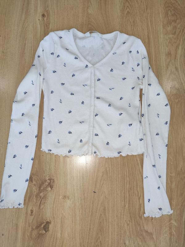 Блуза, легкая коттоновая кофточка для девочки от H86M, укороченная, цвет кремовый с сине-голубыми маленькими цветочками, края блузы и рукавов красиво обработаны, рукав удлиненный, выглядит празднично, красиво тянется так как есть 3% эластана. Ширина по плечам в нерастянутом состоянии 34 см, длина рукава 54 см, длина по спинке 39 см.