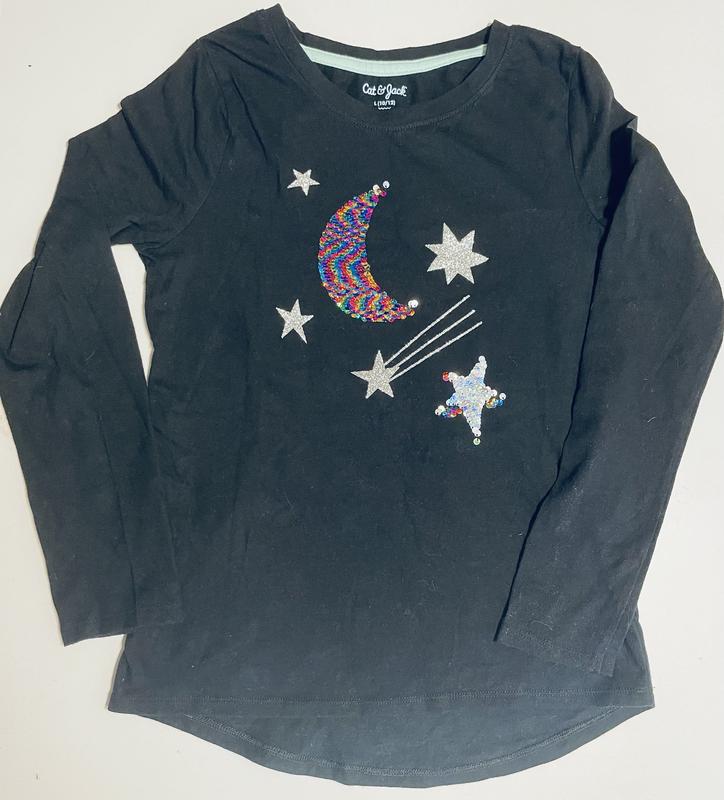 Лонгслів прикрашений зірочками з глітеру та місяцем з паєток. Ззаду подовжений. Тканина: трикотаж, трошки тепленький. ОГ - 77 см. Рукав - 53,5 см. Довжина - 53,5 см. Стан: ідеальний. Бренд: Cat & Jack, Індонезія.