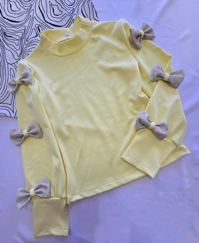 Неймовірно гарна та нарядна кофтинка. Об'ємний рукавчик. Прикрашена з'ємними бантиками( на булавці), при бажанні можна носити чистою. Тканина: французький трикотаж заміри +- 1-2см розмір/ довжина рукава від плеча,/ довжина/ пог 🌺110-116/44/41/28 🌺122-128/49/45/31 🌺134-140/53/49/33