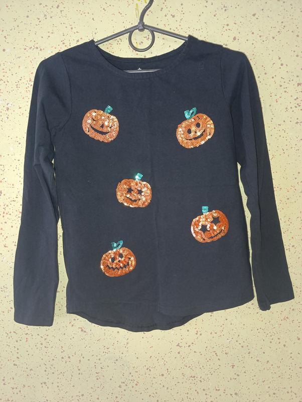 Лонгслив с великолепным принтом из пайеток в виде тыквы с разными смайликами.Подходит как для ношения на каждый день так и для праздника Хэллоуин. Стан идеален. Полу обхват 37 см Рукав 51 см Спина удлиненная.Длина по спине 53,5 см Длина по переду 45 см На возраст 10-11 лет