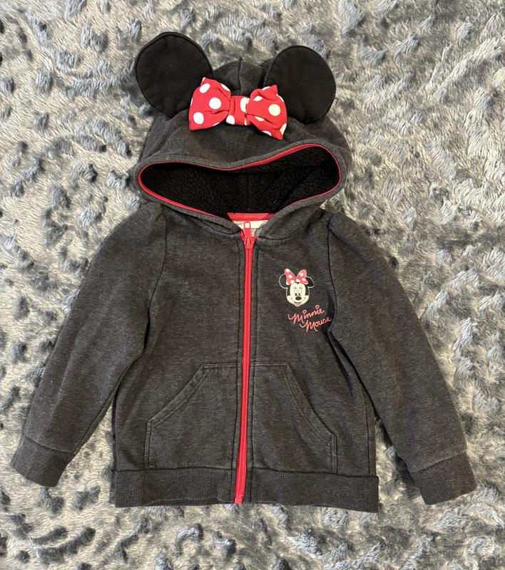 👧 Тепла кофта на дівчинку, розмір 92. Темно-сірого кольору, із капюшоном з вушками та червоною бантиком у білий горошок — у стилі Мінні Маус 🎀 Спереду застібка-блискавка, дві кишеньки. М’яка, приємна на дотик, всередині начіс. Стан відмінний .