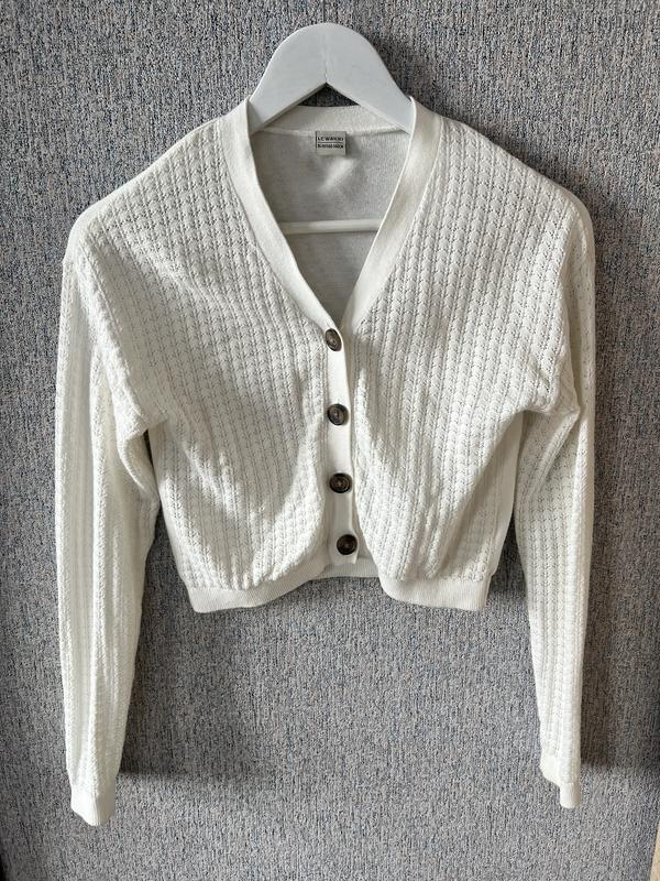 Стильна біленька кофтинка на ґудзиках стан ідеальний,довжина 42 см,рукав 52 см плечі 42 см.