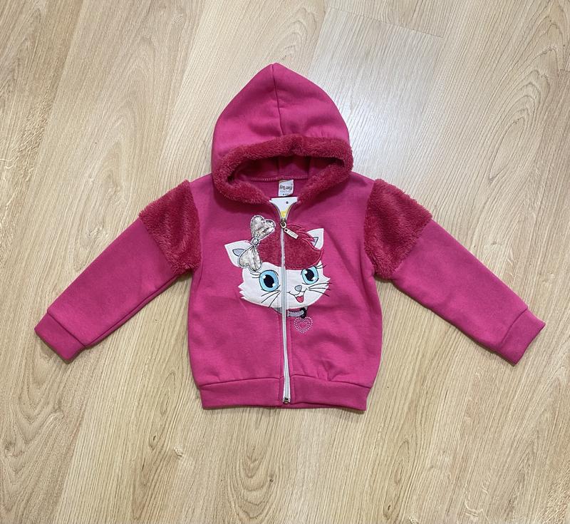 Утеплена кофта на замку. Розмір 4-5. Довжина по спинці 37,5 см, довжина рукава від плеч.шву 32,5 см, плечі 29 см, напівобхват грудей 31 см
