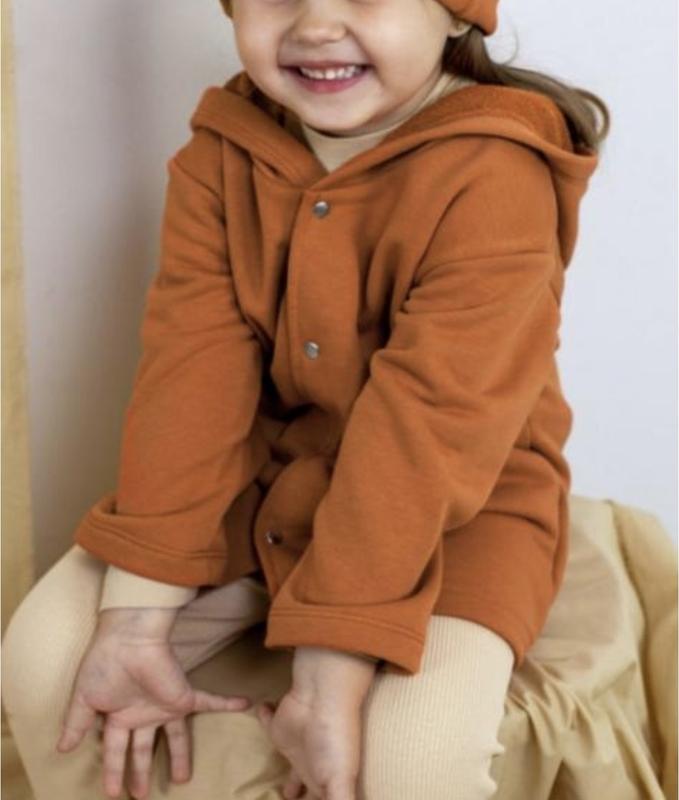 Кардиган вільного крою с капюшоном і застібкою на кнопках. В кольорі паприка. Розмір 104-110. Стан чудовий, був одягнений один раз. Склад: 100% бавовна, трикотаж вищої якості потрійного переплетення з товстими петлями на внутрішній стороні.