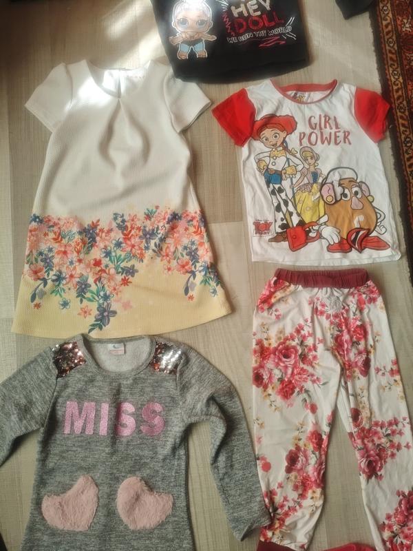 Дуже гарні ексклюзивні речі. Светр LOL, подовжений светр Miss, плаття nutmeg, новенька футболка від Disney, джинсова спідниця, футболки з довгим рукавом, двоє легеньких штанів і бріджи.
