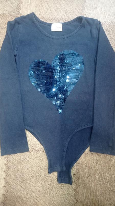 Боди для девочки темно синего цвета с рисунком из паиеток. Застегивается на кнопки. Размер 6, 116 см