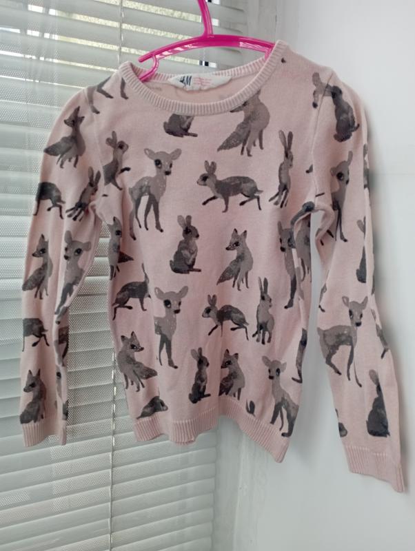 В нормальном состоянии легкий свитер hm 2-4 года, на рукаве след от фломастера, на фото показала длина 40 см ширина 29 см рукав 37 см