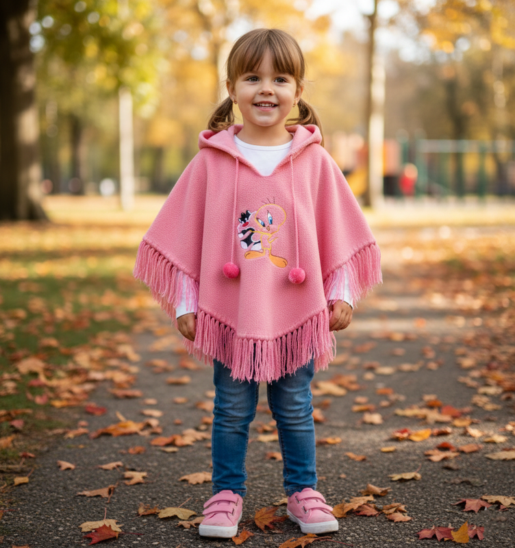 Дитяче тепле, затишне й зручне рожеве пончо з капюшоном. Виготовлення з м’якого флісу. Прикрашене вишивкою з мультяшним персонажем та декоративними шнурками з помпонами, з бахромою по краю, тепле, затишне й зручне. Довжина бокової частини(рукав від горловини) 28, з бахромою 34 см Довжина 44/51 см