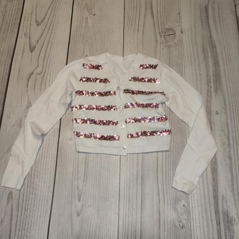 ошатна кофта. Склад 100 проць.бавовна. бирка з розміром зрізана — приблизно 8-10 років (128-134-140).біла, паєтки рожеві та бронзові).довжина 32,рукав 47, у грудях 32, талія 31, низ 30.стояння гарне дивіться інші Мої оголошення