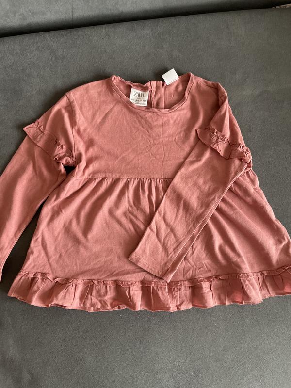 Це дитяча рожева кофтинка Zara з рюшами. Вона має довгі рукави, круглий виріз горловини, рюші на плечах і по нижньому краю.