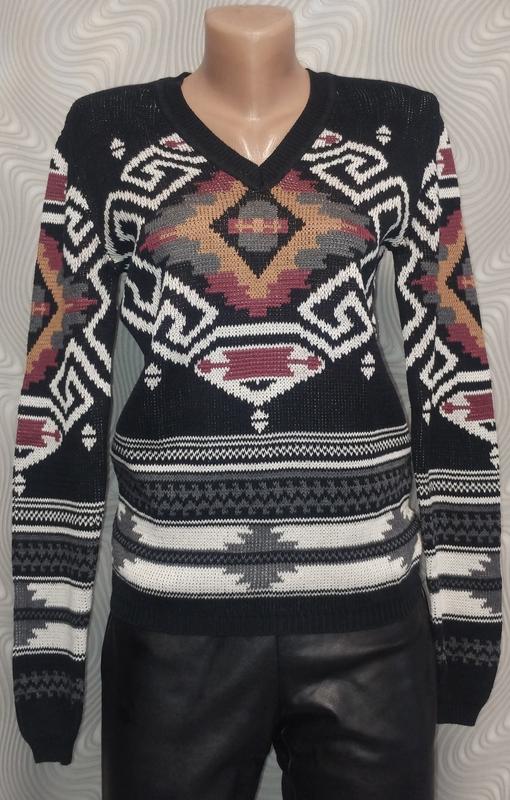 светр з V подібним вирізом і орнаментом на дівчинку розмір XS, S, машинна в'язка, стан ідеальний, плечі 37, груди 42, рукав 65, довжина 62