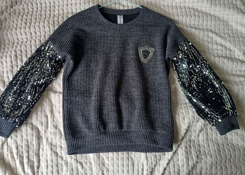 Кофточка приємна, м'яка на дотик. Рукава оздоблені паєтками, візуально всі на місці,прогалин немає.Кофтинка нарядна,гарно виглядає Довжина 50 см Пог 47 см Довжина рукава від горловини 58 см