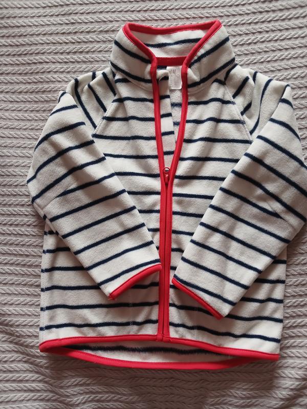 М'якенька та тепла фліска Комір - стійка, всі краї кофтинки оброблені манжетом-тасьмою Біла в темно-синю смужку Склад:100% поліестер Розмір: 92 (1,5-2 роки)