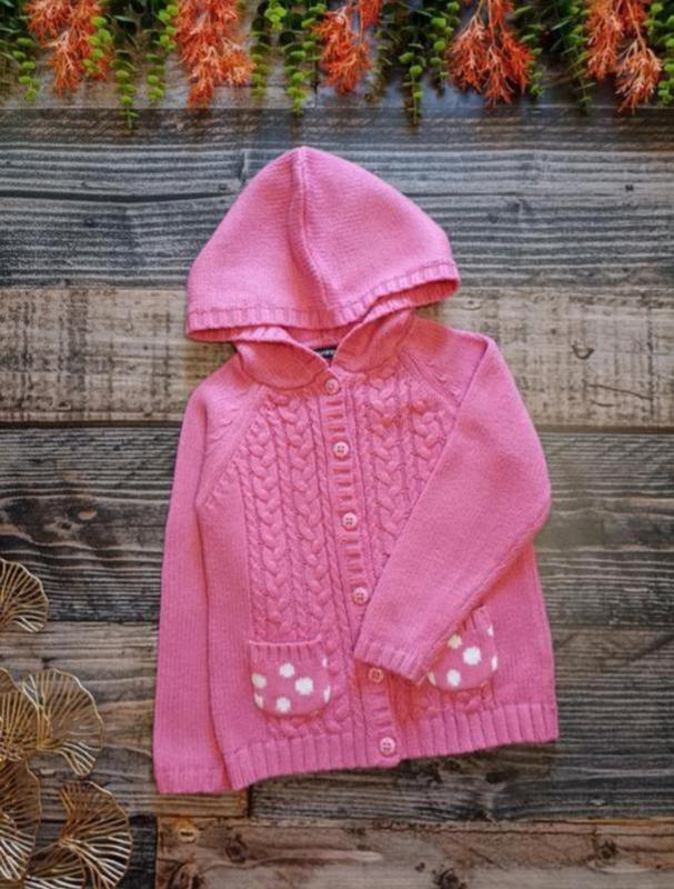 Кофтинка в прекрасному стані, не тягнеться, застібається на гудзики, машинна в'язка, є маленькі кишені та капюшон, заміри є на фото.