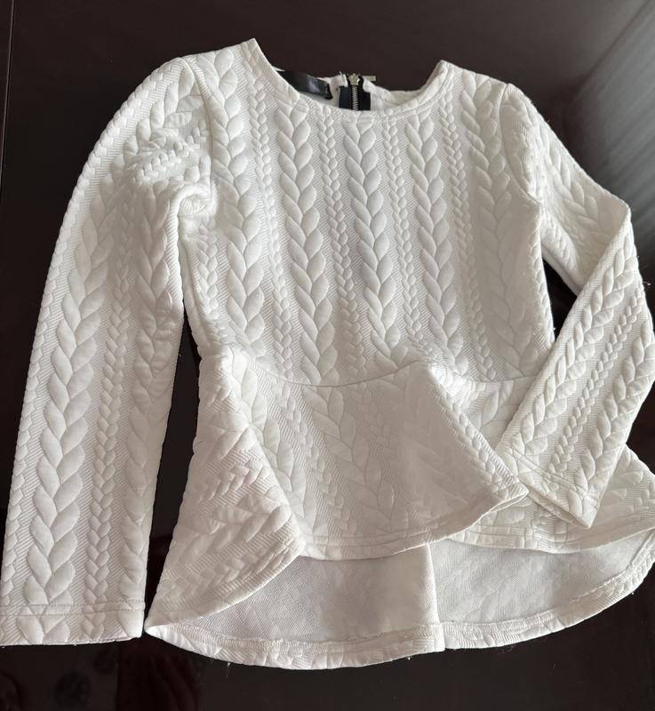Гарна кофтинка дитяча, 122 розміру. Тканина з 3д ефектом плетеної коси. Має застібку залізну ззаду. Фасон- баска, спереду трохи укорочена, позаду подовжена.