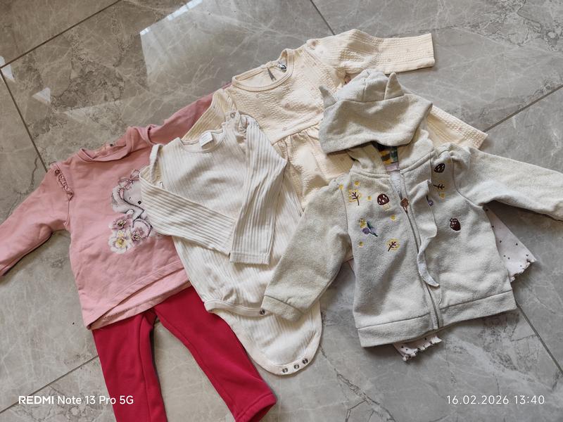 Продаю пакет дуже ніжного та якісного одягу для дівчинки віком 9-12 місяців (зріст 74-80 см). Речі у відмінному стані, чисті, без плям. У пакет входить: Тепла кофтинка на змійці з капюшоном та милими вушками. Ніжна сукня в дрібний принт. Рожевий світшот з якісним принтом зайчика. Яскраві малинові штанці та базові лосини в сердечко. Два боді на довгий рукав (одне з рюшами, інше — з принтом сердечок). Всі речі м'які, приємні до тіла, ідеально поєднуються між собою.