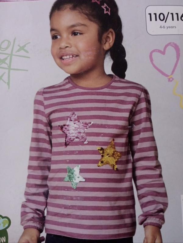 Дуже красивий лонгслів на дівчинку від lupilu з нової колекції.Виглядає дуже стильно ,рукавця ідуть на резиночках,зірочки вишиті паетками , змінюють колір . кофтинки йдуть в упаковках тому можна презентувати на подарунок. Склад 100%хлопок. заміри 110 116 на 4-6 років довжина 46 см ДПГ 33 см довжина рукава від плеча 40 см