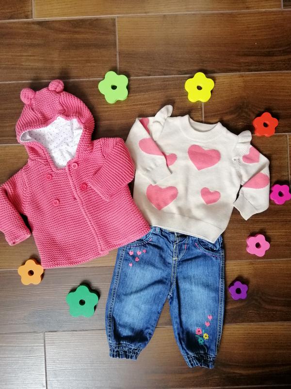 Комплект для дівчинки 3-6міс у відмінному стані. 🧥 Кардиган M&S, на бирці 0-3,але большемерит. Рукав 21см, довжина 26см - 140грн. 👕Ніжна кофточка з рюшиками Nutmeg 3-6міс в ідеальному стані, одягнена пару разів. Рукав 22см, довжина 27см - 80грн. 👖Джинсики Mothercare 3-6 міс в ідеалі. У поясі стяжка, знизу на резинці. Довжина 34см, пояс 20см - 120грн. Комплект за 300грн