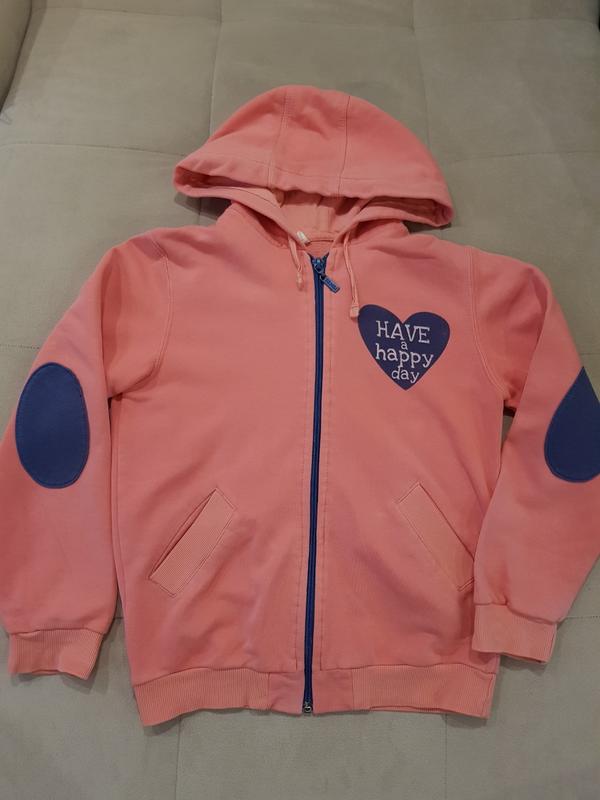 Гарна спортивна кофтинка абрикосового кольору на дівчинку на зріст 134 -140 див. Купувала доньці на фізкультуру. Є 2 кишені. Продаю, бо донька зростала. Висота по спині 52 см, ПОГ 38 см, довжина рукава по плечу 49 см (по внутрішньому шву 38 см). Склад 100% cotton.