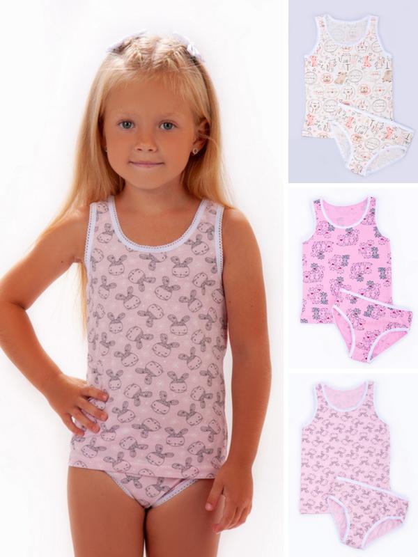 92р - 135грн 98р, 104р - 149грн 110р, 116р - 159грн 122р, 128р - 169грн Комплект для дівчаток - майка та трусики, виготовлений з полотна "Кулір". Дане полотно одне з найкращих, що підходить для виготовлення спідньої білизни, воно легке, на бавовняній основі (з натуральної сировини) - завдяки цьому не викликає алергічних реакцій та дискомфорту. Маєчка та трусики обшиті еластичною резинкою, яка не давить та не пережимає - такий комплект для діток буде надзвичайно комфортним та зручним. Полотно: кулір. Склад: 100% бавовна.