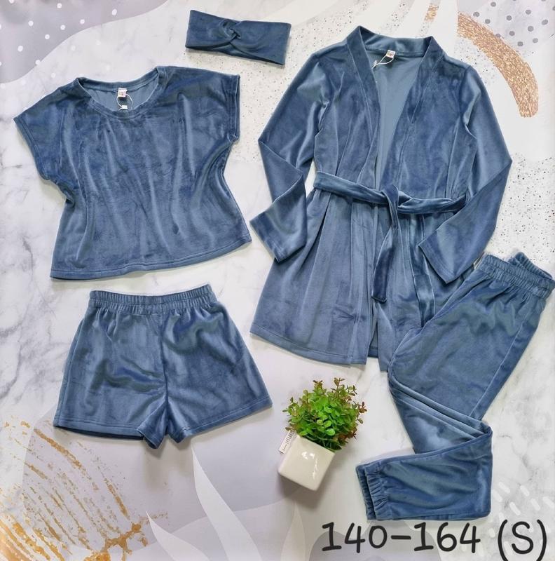 Мега новинка Комплект 5в1 Тканина королівський велюр В комплект входять: -футболка-топ, -шорти -штани під РЕЗИНКУ -халат з поясом -пов'язка ЯКІСТЬ СУПЕР! ПОВНОМІРНІ!!! 140(3 шт)-довжина халата 63,рукав 48,пог 43,довжина футболки 42,пог 43,довжина штанів 86,крок 65,пояс 26,довжина шортів 27,пояс 26 146(2 шт)-довжина халата 69,рукав 50,пог 44,довжина футболки 46,пог 45,довжина штанів 92,крок 70,пояс 27,довжина шортів 28,пояс 27 152(3 шт)-довжина халата 72,рукав 52,пог 48,довжина футболки 47,пог 47,довжина штанів 98,крок 73,пояс 28,довжина шортів 30,пояс 28 158(5 шт)-довжина халата 75,рукав 57,пог 50,довжина футболки 49,пог 48,довжина штанів 102,крок 78,пояс 29,довжина шортів 32,пояс 29 164(4 шт)-довжина халата 77,рукав 60,пог 51,довжина футболки 51,пог 50,довжина штанів 105,крок 82,пояс 30,довжина шортів 33,пояс 30 170(S)-(5 шт)-довжина халата 79,рукав 63,пог 53,довжина футболки 52,пог 53,довжина штанів 107,крок 84,пояс 31,довжина шортів 34,пояс 31 +-2 см
