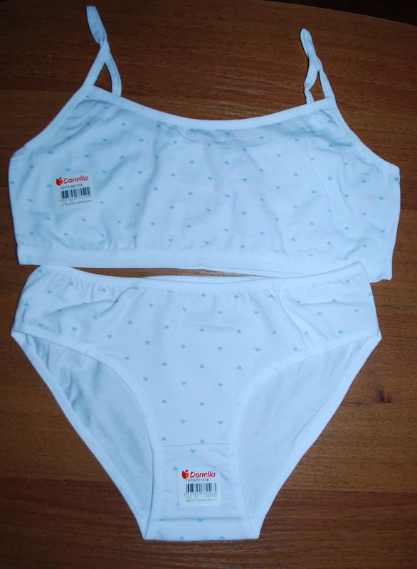 В наличии комплект производства Турции фабрика Donella по составу 95% хлопок и 5% эластан размер 10-11 рост 146-152 топ длина 22 см, полуобхват груди 30 см трусики резинка 25 см, высота 19,5 см