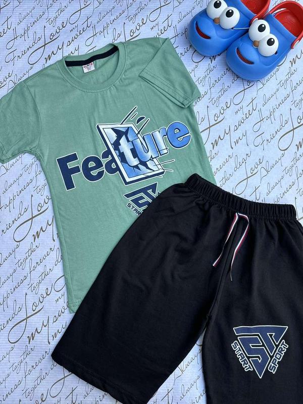 Розмірний ряд: 8-9 років - 134 ріст-футболка довжина 50 пог 33, шорти довжина 43, пояс 26/36 10-11 років, 146 ріст-футболка довжина 55 пог 38, шорти довжина 47, пояс 27/37 Комплект для хлопчиків Туреччина. Модель стильна, практична. Склад: 100% Cotton