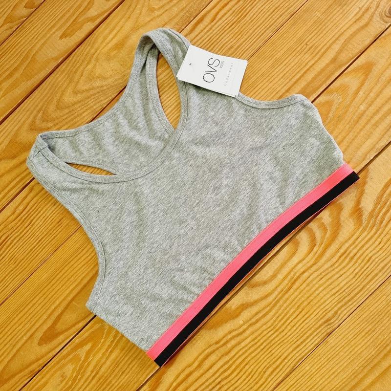 Трикотажний топ для дівчинки від бренда OVS (Італія), спинка-борцовка. Внизу яскрава неонова смужка — фото не передає. Колір: Сірий Склад: 95% бавовна, 5% еластан. Рост 170 (14+ лет) - напівобхват грудей 33 см