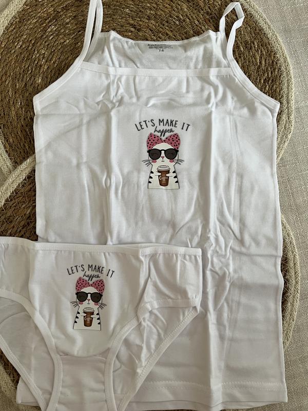 Біленький набір з майки та трусиків для дівчинки від турецького бренду Katamino) Дуже приємні на дотик, еластичні та гарної якості! Виробник: Туреччина Склад: 95% бавовна 5% еластан Розмір: 7-8 років