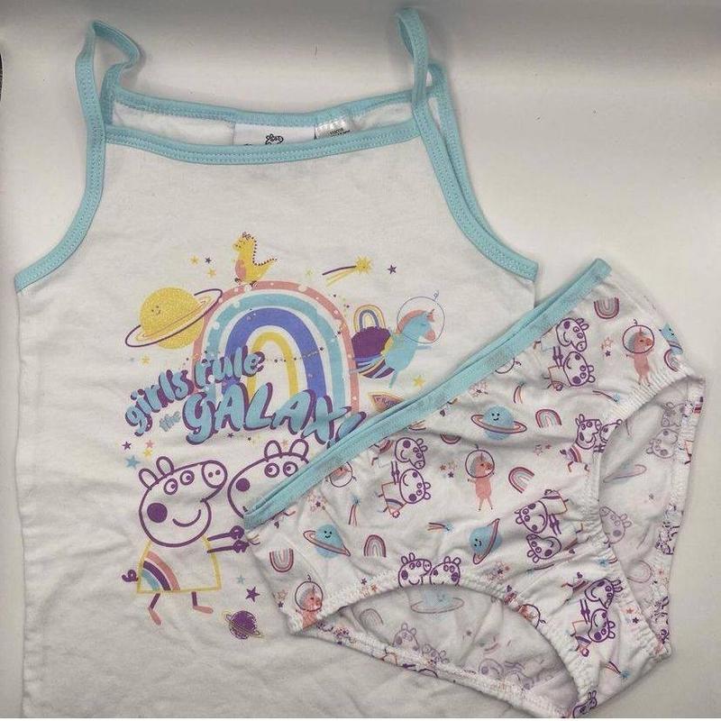 Комплект білизни для дівчинки (майка+ труси) р. 122/128см (6-8 років) Майка: напівоб’єм грудей -29см, довжина -43см Труси- напівоб’єм стегон -25см, висота-19см 95/100% бавовна Peppa Pig-Німеччина