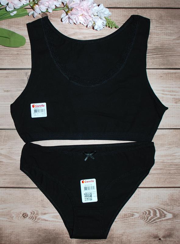 топ довжина 26 см, напівобхват грудей 33 см - горловина з мереживом трусики резинка 27х2 см, висота 20 см розмір 12-13 (152-158) Підлітковий комплект топ трусики виробництва Туреччини фабрика Donella за складом 95% бавовна і 5% еластан