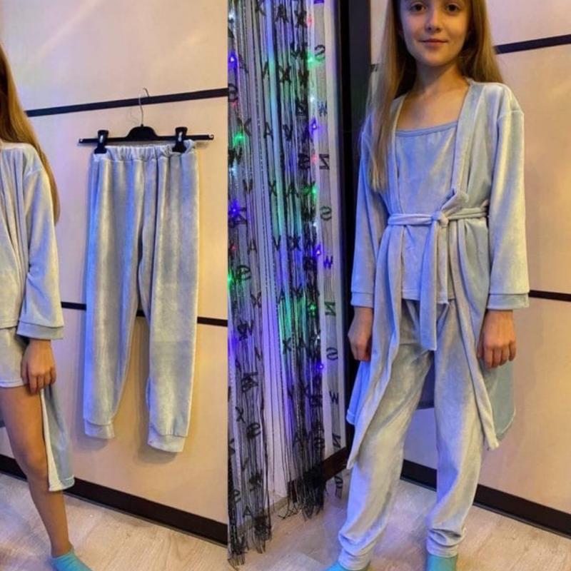 ✔ Это нечто! Супер комплект для девочек! Велюр! Качество- супер! Комплект из 4 ед: – халат – штаники – майка – шорты * расцветки ассорти (малина, розовый, пудра, бардо) ✔ Размеры: 60 (98-104)-майка дл 35,шорты дл22, штаны61/37, халат рук28,дл 59 64 (110-116)-майка дл 38,шорты дл23, штаны67/47, халат рук31,дл 64 68 (116-122)-майка дл 41,шорты дл25, штаны77/57, халат рук34,дл 74 72(122-128)-майка дл 45,шорты дл27, штаны82/59, халат рук37,дл 78 76(128-134)-майка дл 47,шорты дл29, штаны91/67, халат рук40,дл 81 80 (134-140)-майка дл 47,шорты дл29, штаны92/67, халат рук44,дл 87 ✔.крох