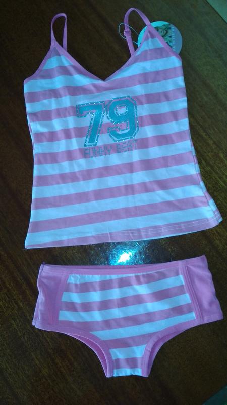 13/16, 116-128 комплект Заміри: трусики пояс 26, висота 16 майка пог 28, брительки регуліруються того довжина майки 40-47 95%бавовна, 5%еластан 125 грн.