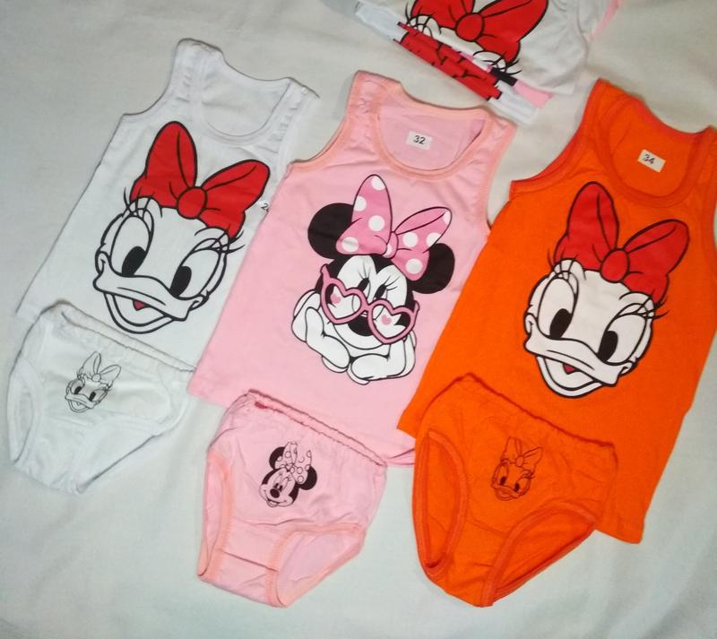 В наявності нижня білизна для дівчаток. Комплект складається з трусиків і маєчки, тканина кулір ( бавовна). Розмір 28 на ріст 92-98 колір білий. Розмір 30 на ріст 98-104 колір білий. Розмір 32 на ріст 104-110 колір рожевий. Розмір 34, на ріст 110-116 білий і оранжевий.