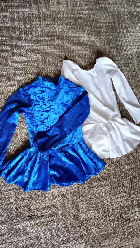 Продам костюмы на девочку для танцев,белый 5-6л,синий 6-7лет. Оба в хорошем состоянии