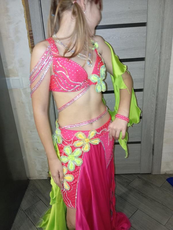 Продам дуже яскравий к,красивий переможний костюм не дорого на зріст 140-155 р.Ракс,табла,межансе В дуже хорошому стані ПОліфа-30 см ПО пояса юбки-29 см на резинці пояс тянеться Довжина юбки -95 см