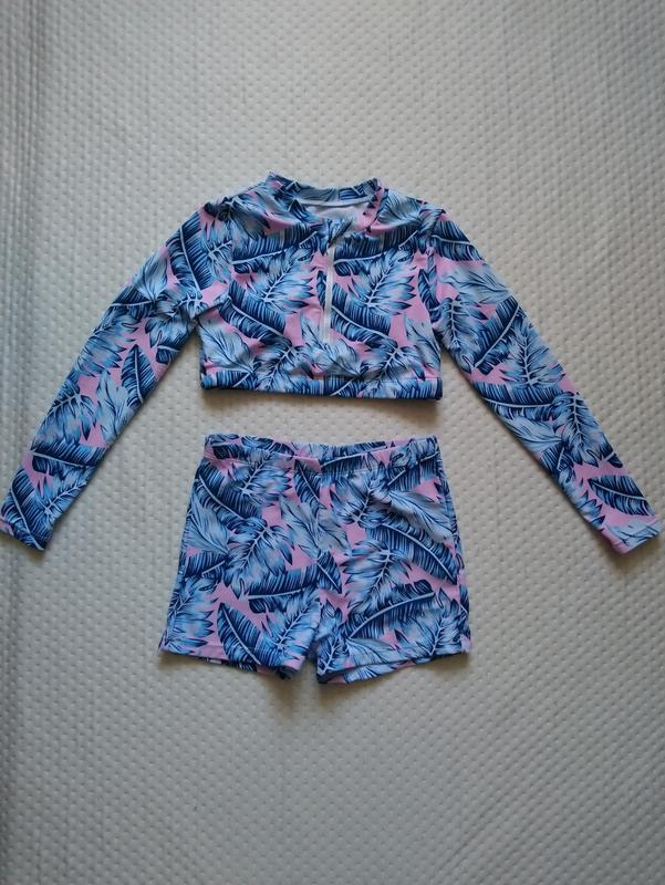 В дуже хорошому стані. З дефектів катишки на рукавах. На вік 9 років. Матеріал 82 поліестр і 18 еластан. Висота верху 23 см. В плечах 27 см. Під руками 31 см і тягнеться до 46 см. Рукав від плеча 44 см. Висота шортів з боку 24 см. Півобсяг пояса 25 см і тягнеться до 42 см