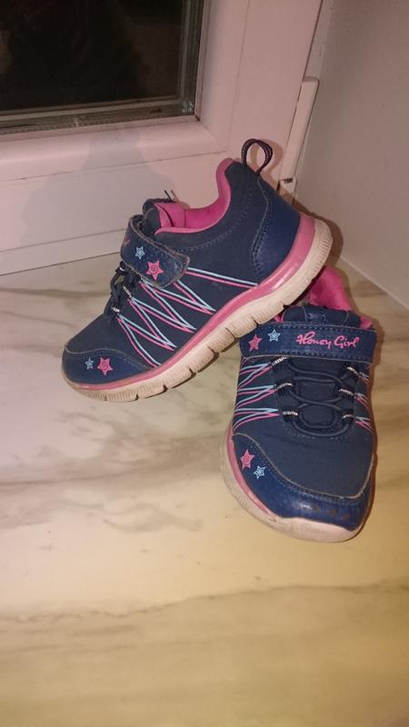 Кроссовки Honey Girl для девочки. Размер 26, длина по стельке 16см. Цвет синий, с голубым и розовым принтом. Застёжка - шнуровка и липучка. Материал верха - комбинированный: кожзам и текстиль. Внутри - мягкий текстиль. Кроссовки лёгкие и удобные, на не скользких подошвах. Состояние хорошее. Из недостатков - небольшие потёртости на носках.