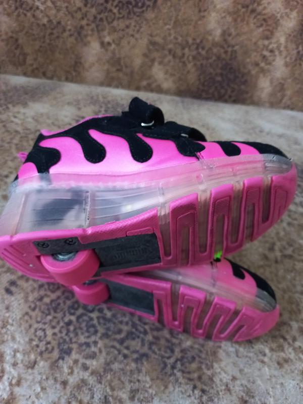 кросівки в яких можна не тільки ходити, але й кататись, колеса фіксуються кнопкою, можна також натиском на кнопку колеса сховати, дитина каталася в приміщені на вулицю не ходила кросівки в дуже гарному стані.