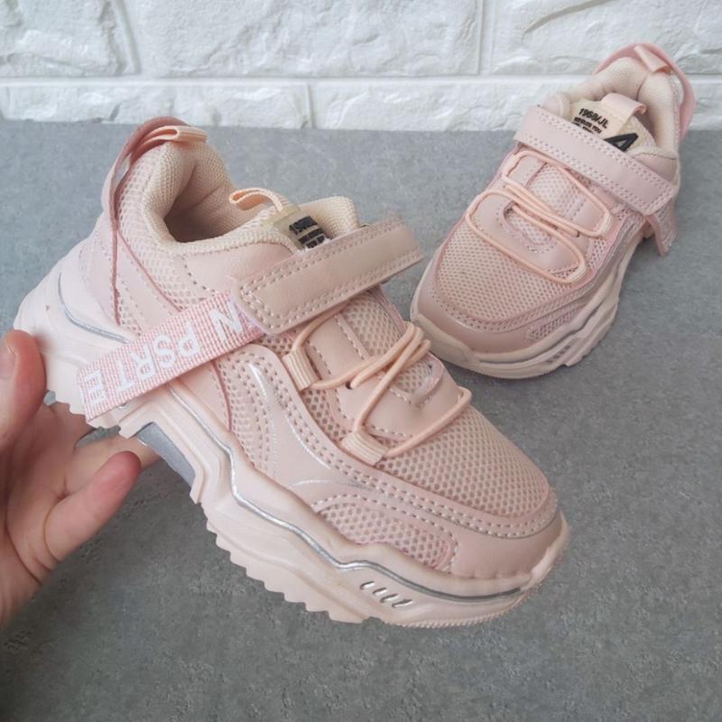 блідо-рожеві, верх текстиль та еко-шкіра, в середині устілка шкіряна з супінатором, регулюються шнурками-резинкам та ліпучкою. 31р устілка 20см