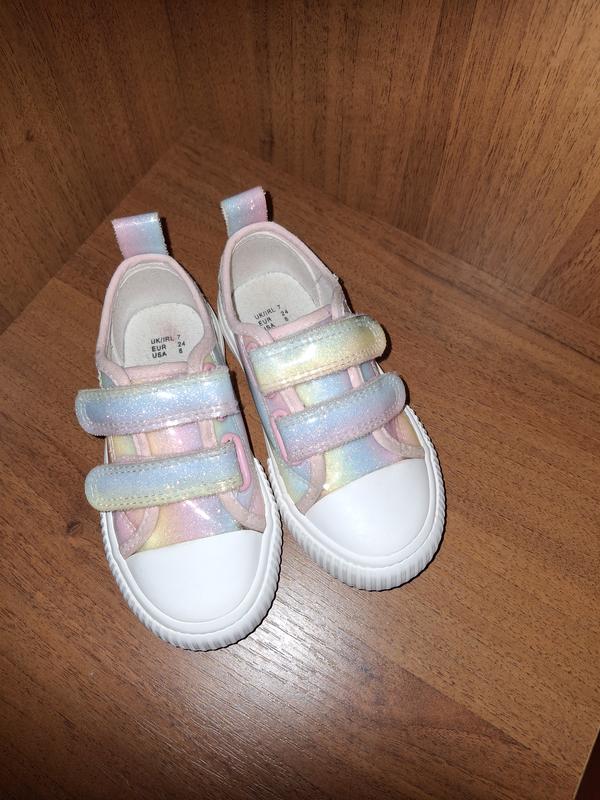 Продам дитячі кросівки Primark для дівчинки, розмір 24 (EUR), 7 (UK), 8 (USA). М'які та зручні, з блискучим переливчастим верхом у ніжних кольорах. Легко застібаються на липучки — ідеально для самостійного взування. Стан дуже хороший, були вдягнені кілька разів, без плям і пошкоджень. Довжина устілки — приблизно 15 см. Підійдуть як для прогулянок, так і в садочок.