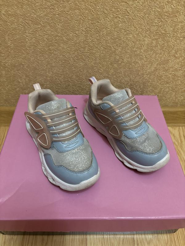 Кросівки для дівчинки на весну, літо та теплу осінь. Довжина устілки 19 см, не виймаються. Підошва світиться по боках при ходьбі, в робочому стані два кросівки. На липучках, дуже зручно взувати, сіточка зверху переливається срібним кольором.
