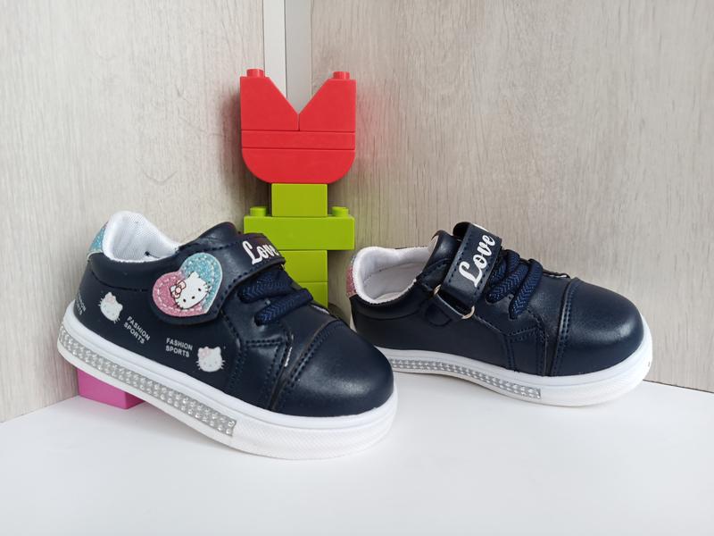 Дуже красиві кеди з Кітті для дівчаток від ТМ "W. niko" 🐱 Верх - кожзам, всередині шкіряна устілка з супінатором. На ніжці фіксуються з допомогою шнурків гумок і липучки. Підошва декорована камінчиками Виміри: 22-13,7 см 23-14,2 см 24-15 25-15 см,5 см Допустима похибка у вимірюваннях +-2 мм