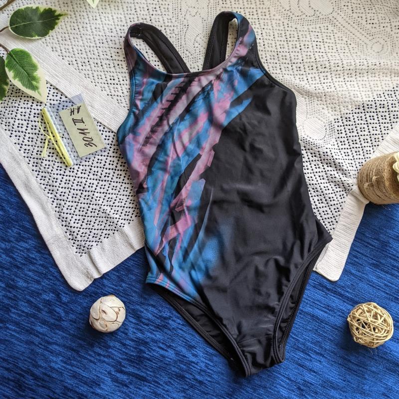 купальник чорний з блакитного фіолетовими разводами поперек є підклад фірма f&f 5-6 років дуже хорошої якості довжина складено довжина 49 тягнеться до 61 v грудях 27- 35