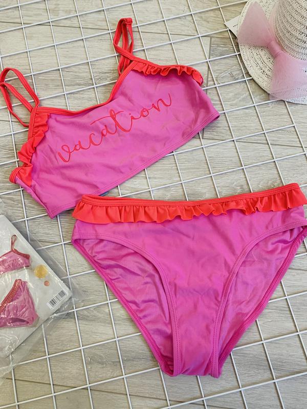 Раздельный купальник на девочку розового цвета имеет рюшики Бретели регулируются