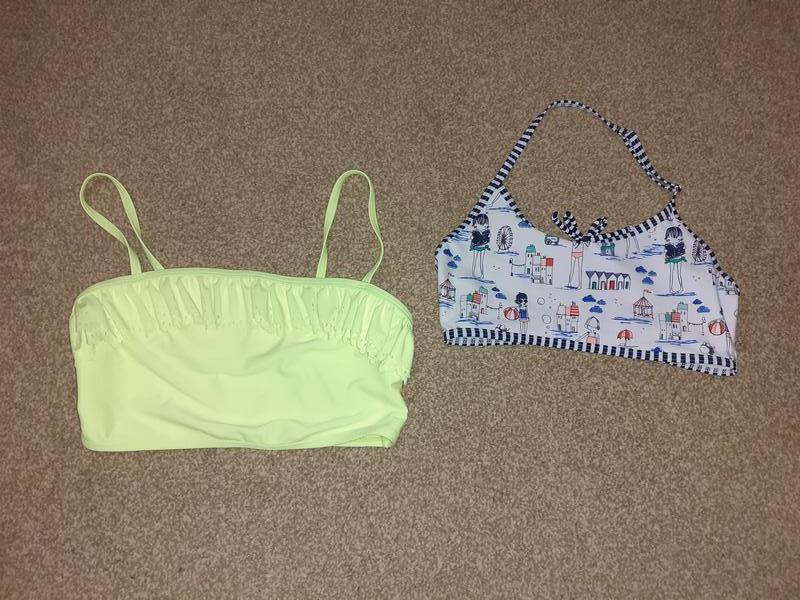 Верх неоново жовтий на дівчинку 13 років Next, на ріст 158 см.Спереду підшитий на резинці без застібки. Верх морський на 11-12 років Next ріст 152 см. Підшитий на застібку.