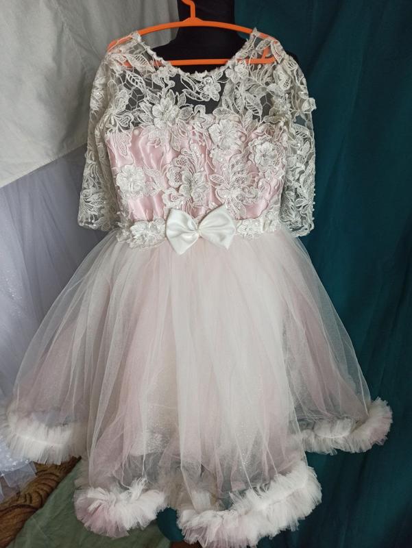 Детское нарядное пышное платье примерно на 3 годика . ОГ до 60 см. От до 56 см. Длина платья по спинке -73см. Длина рукава -29 см. Корсет сзади на шнуровке, юбка -пачка, очень пышная, нижний слой с блеском. Хорошее состояние. Цена -125 грн.