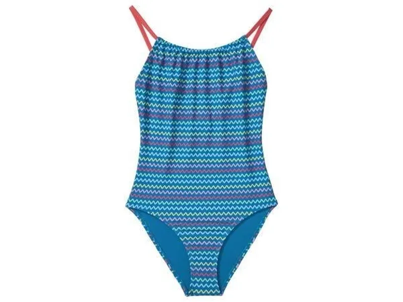 Яскравий цільний купальник для дівчинки від Pepperts блакитний у зигзагах рожевого, жовтого, червоного кольору. Підкладка блакитна. Вузькі регульовані рожеві лямки. Купальник ідеально підходить для пляжу та басейну. Стан б/в у відмінному стані Виробник Pepperts Розмір 134 Колір блакитний Виміри: напівобхват грудей 27 см, довжина з бретельками 57 см