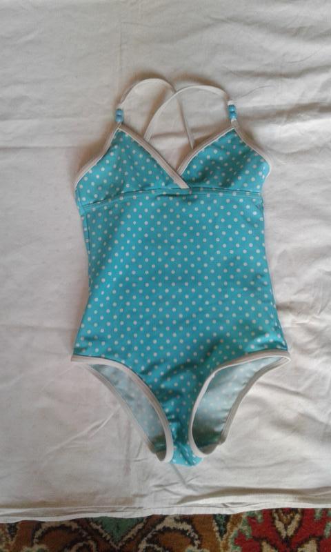 Детский слитный , закрытый ,сплошной бирюзового цвета в мелкий белый горох и с белой окантовкой и бретелями купальник в бассейн или на пляж .George . На возраст 4-5 лет . На рост 104-110 см .Грудь на подкладке .